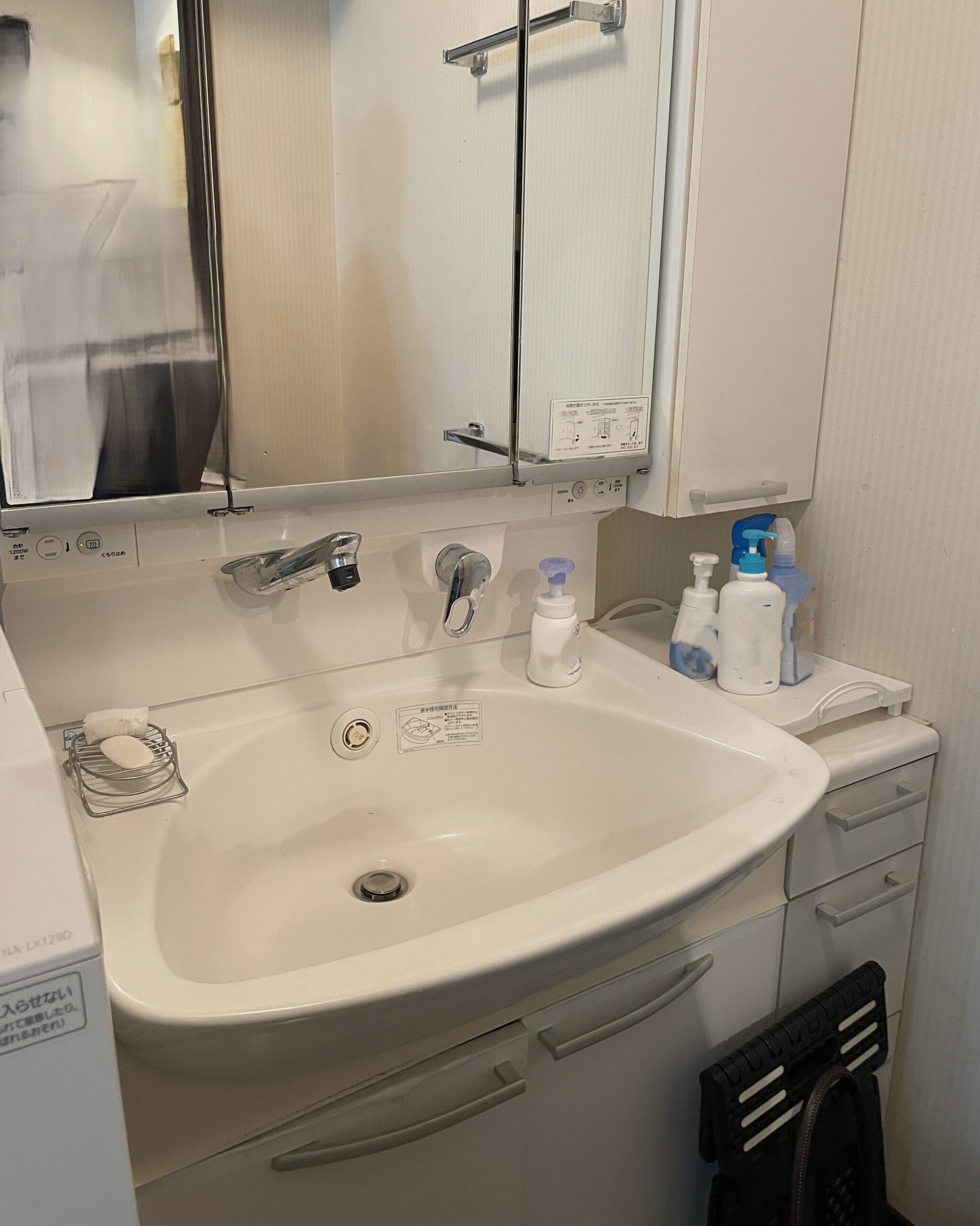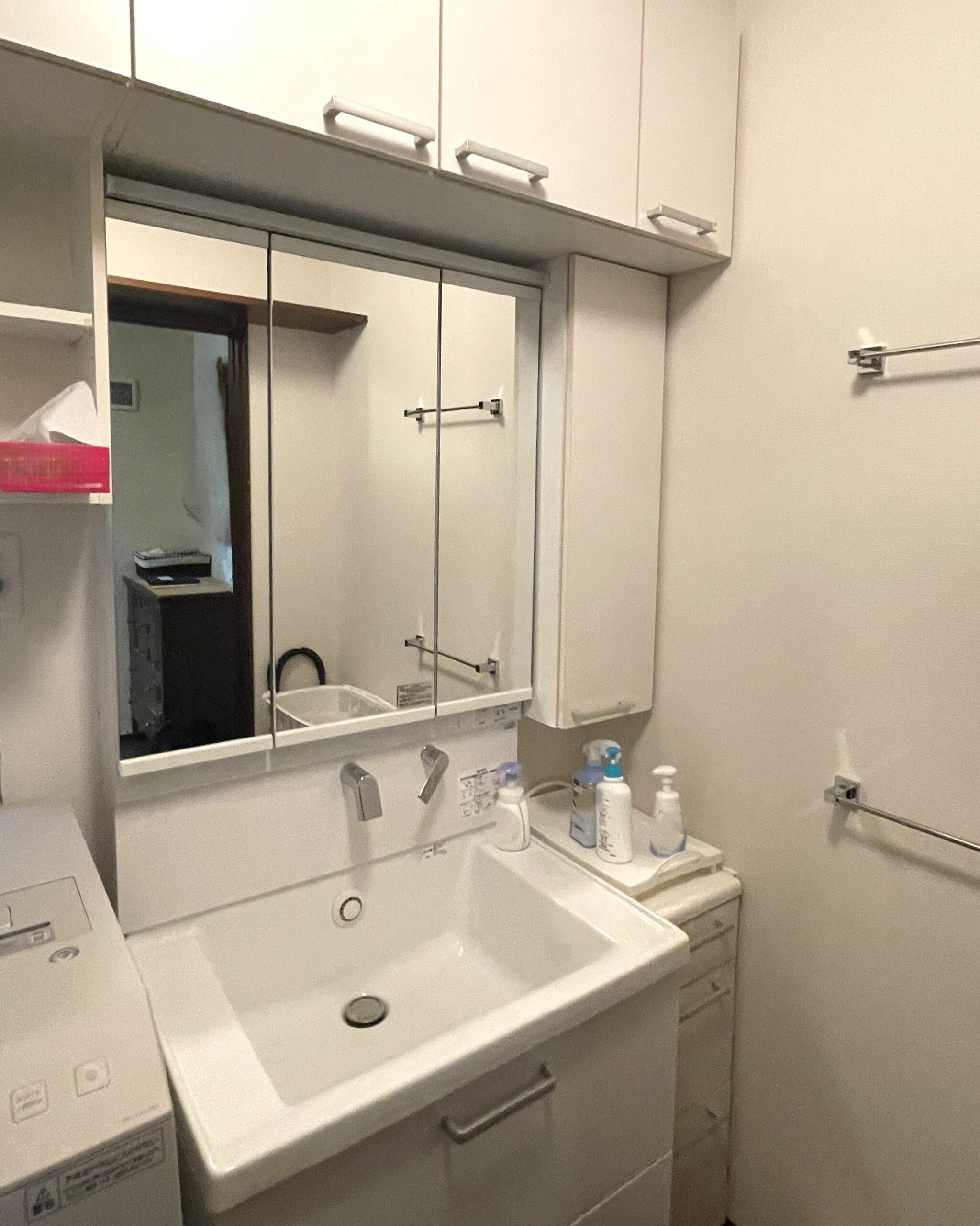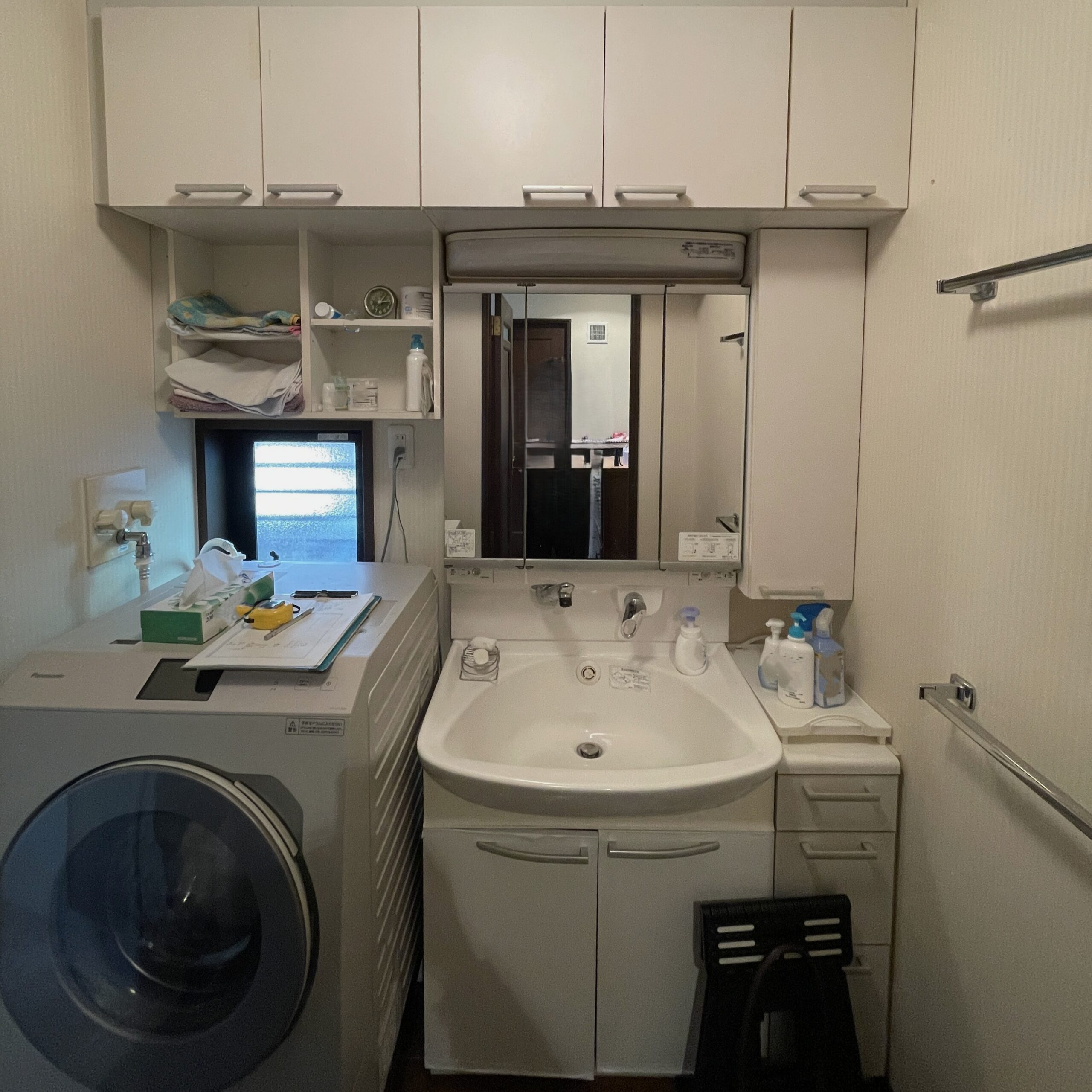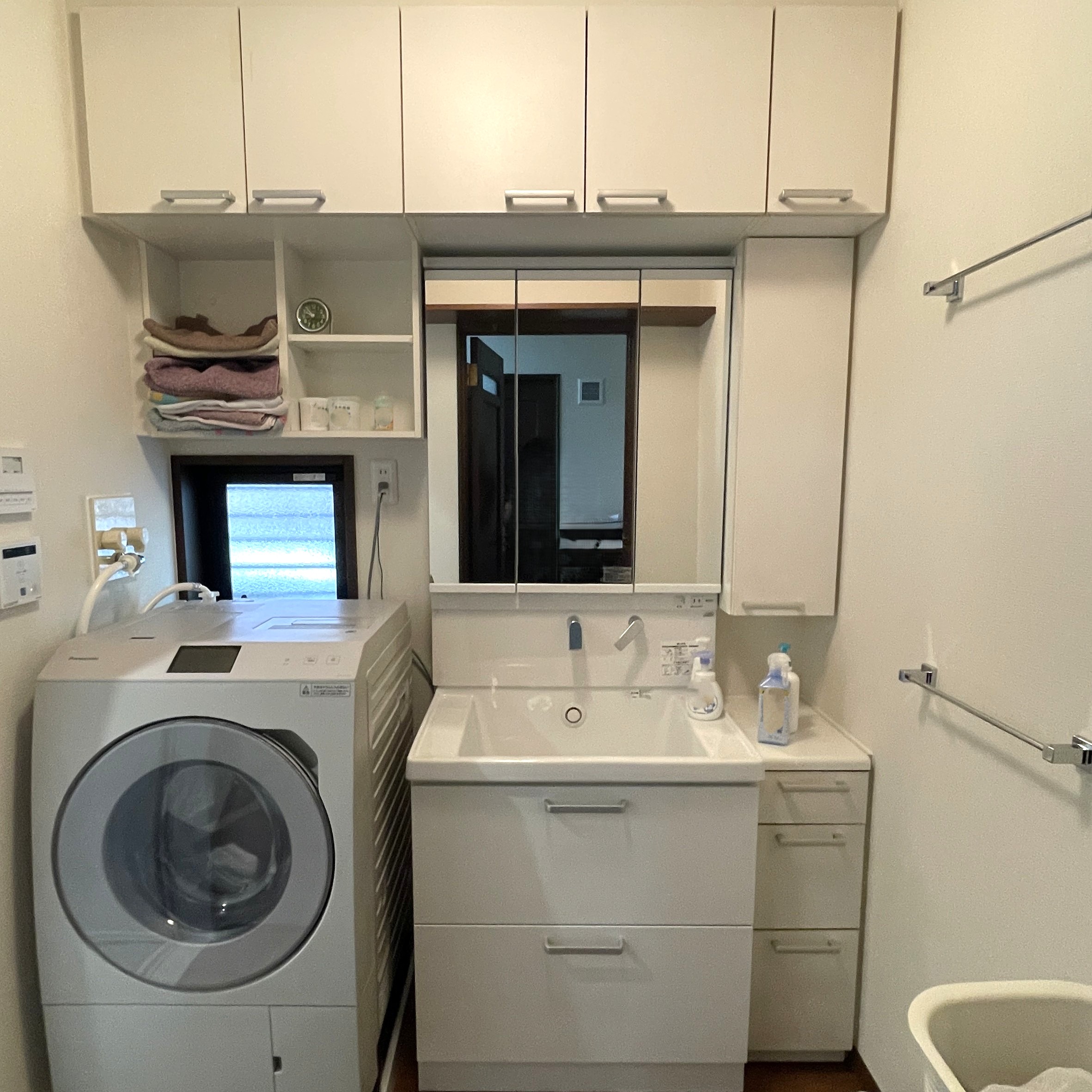 設備の老朽化と、洗面所の床がふかふかしてきたのをきっかけにリフォームを決めました! 洗面所の既存の吊戸棚とサイドキャビネットの再利用。 吊戸棚とサイドキャビネットも全部外してから再度設置したので、 新しく交換した洗面台とも、とてもおさまりが良くキレイになりました。