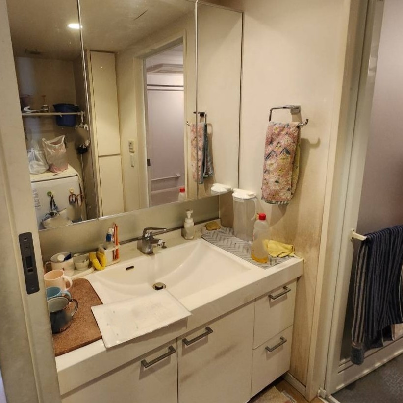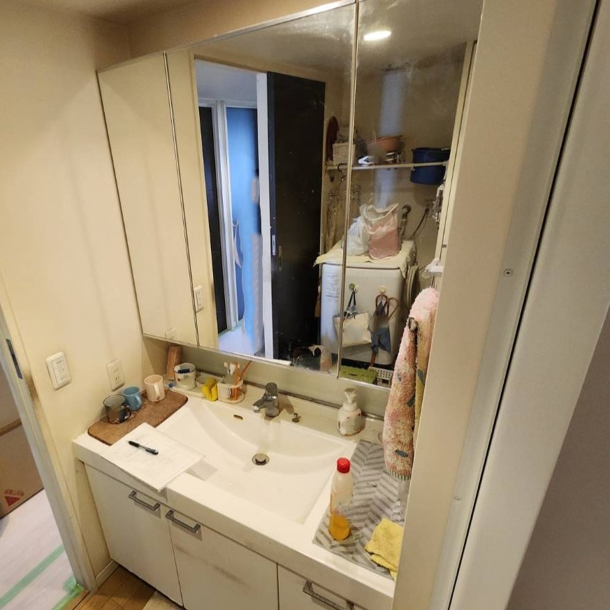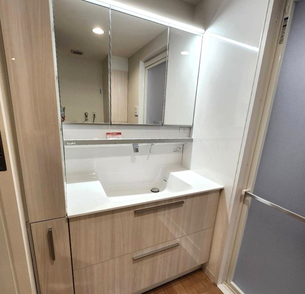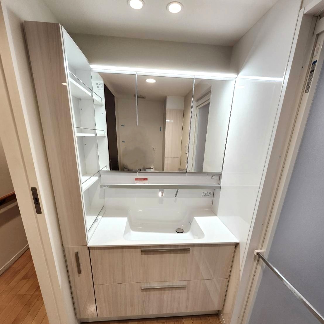 洗面と同じデザインで揃えて色合いもあたたかく使い勝手も良くなりました。